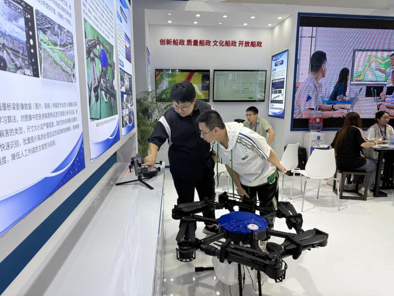 我院受邀参展并在主宾馆设立展区,重点展示了一系列兼具技术实力与应用价值的成果,包括传承船政文化的赶缯船结构复原模型,聚焦智能装备领域的 AIS 交通流分析系统、Ener16p 农业植保无人机、无人机协同指挥系统、桥梁无人机巡检及AI 病害识别系统等,丰富多元的展品吸引了众多参会观众驻足咨询、互动体验并拍照记录。