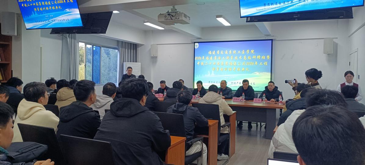 2026年1月23日上午,由福建船政交通职业学院轨道交通学院承办的“福建省交通系统工匠学院2025年福建省施工测量技术高级研修班暨中铁二十四局集团福建公司2026年工程测量培训班”在福建船政交通职业学院校友楼轨道学院三楼会议室顺利开班。中铁二十四局集团福建公司总工程师林剑忠、工程管理部部长洪淮斌、党委干部部副部长王烨、测绘中心主任曾志鑫,学校工会常务副主席、福建省交通系统工匠学院副院长王雪梅、轨道交通学院党政领导、中铁二十四局集团福建公司全体培训学员、轨道交通学院教师代表及工作人员参加仪式。开班仪式由轨道交通学院副院长陈宏意主持。