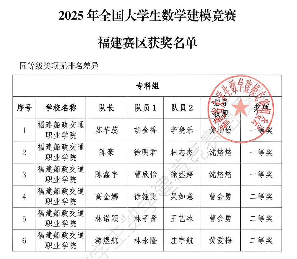 近日,2025年全国大学生数学建模竞赛福建赛区获奖名单正式揭晓。福建船政交通职业学院学子再创佳绩,共有6支参赛队伍全部获奖,其中一等奖3项、二等奖3项。