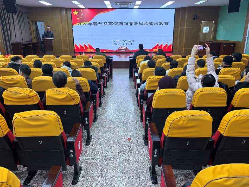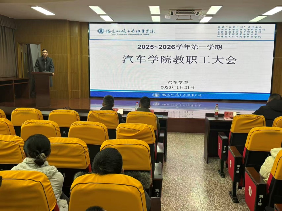 2026年1月21日,汽车学院在行政楼六楼学术报告厅召开全体教职工大会,学院党政领导及全体教职工全员参会。