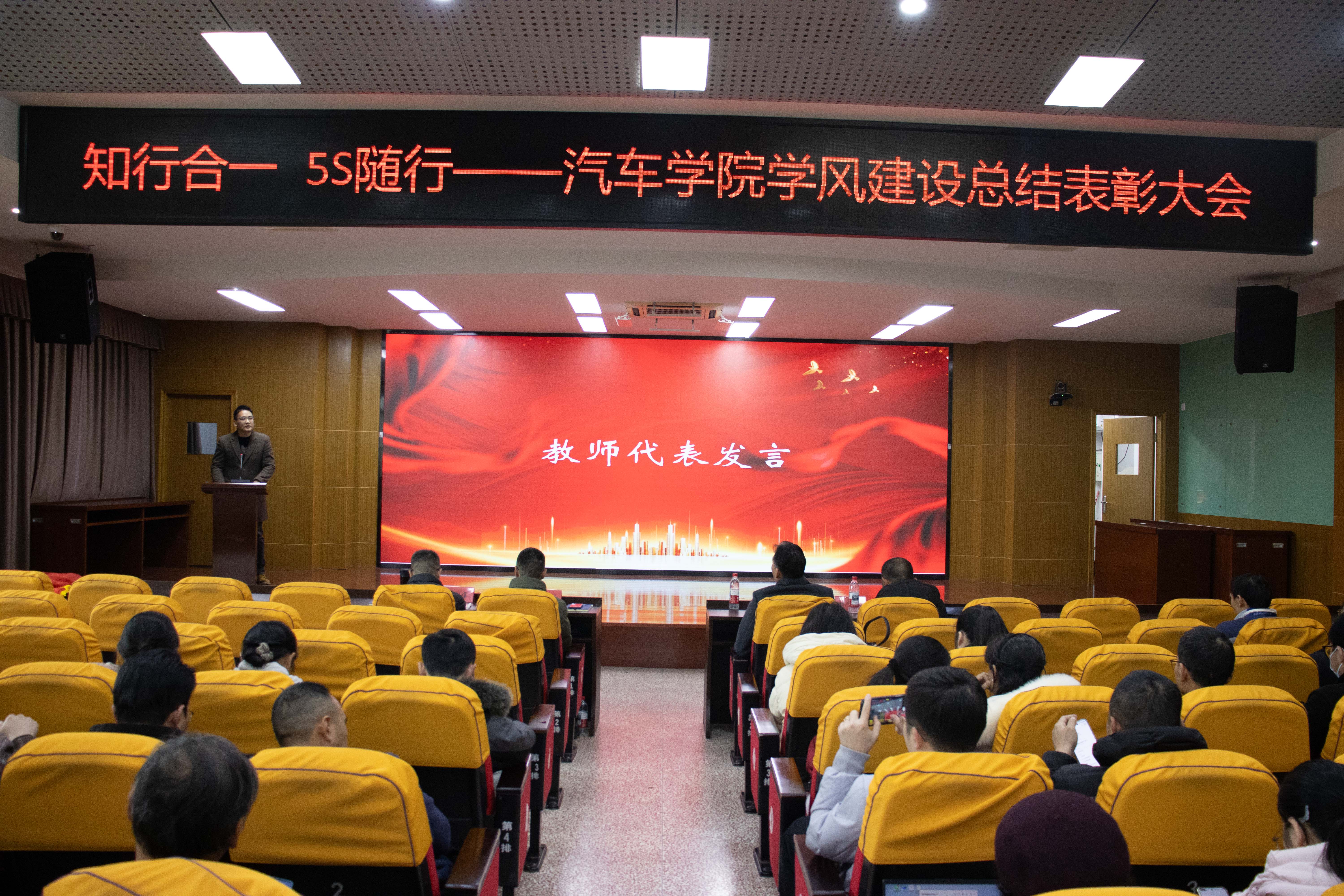 为进一步加强学风建设,表彰先进、树立典型,汽车学院于1月21日在北区一号行政楼6楼学术报告厅开展“知行合一、5S随行”——汽车学院学风建设总结表彰大会。学院领导班子、全体教师、辅导员及各班级学生代表参加此次大会。大会由分团委书记余晨炜主持。