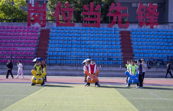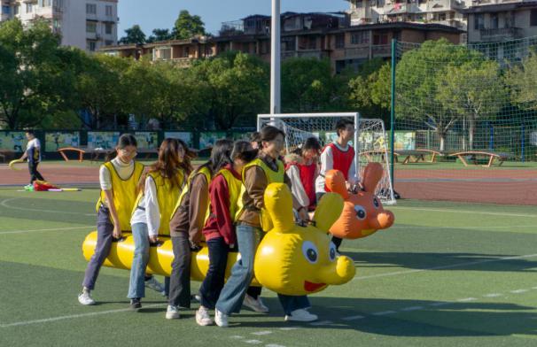 活动开始,主持人系统解读游戏规则、安全须知及积分机制,同步开展现场演示,确保每位同学精准掌握玩法;指令下达后,团建游戏正式启动,现场气氛快速升温,欢乐氛围愈发浓厚。首个环节“万脚齐频”中,五人一组跨上充气道具,喊着整齐口号校准步调、同步发力,稳步前行的每一步,都彰显着团队默契与协作意识;随后的“盲人互打”游戏将氛围推向高潮,参赛同学佩戴眼罩凭听声辨位展开对抗,场外队友实时精准指挥,大家在趣味竞技中锻炼反应能力,释放身心压力。活动全程,同学们抛开拘谨,主动沟通协作,陌生同学从初识磨合到高效配合,处处洋溢互助温情;挑战遇阻时彼此鼓劲,目标达成后共享胜利喜悦。