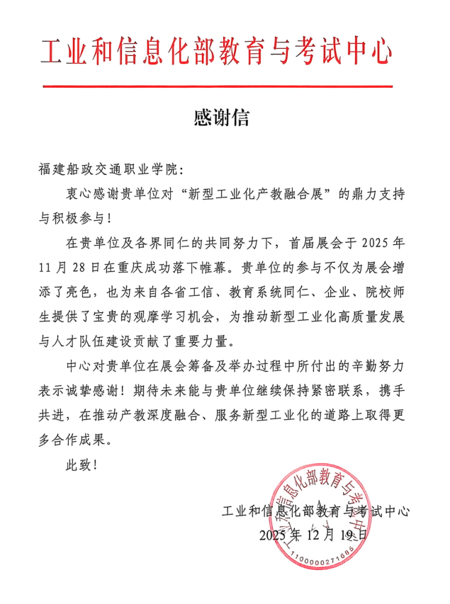 2025年11月28日,首届"新型工业化产教融合展"在重庆成功举办。我院受邀参展,为各省工信、教育系统同仁、企业及院校师生提供了宝贵的学习交流平台。近日(12月19日),工业和信息化部教育与考试中心向我校发来感谢信,肯定我校对推动新型工业化高质量发展与人才队伍建设所作贡献,并期待未来继续深化产教融合合作。