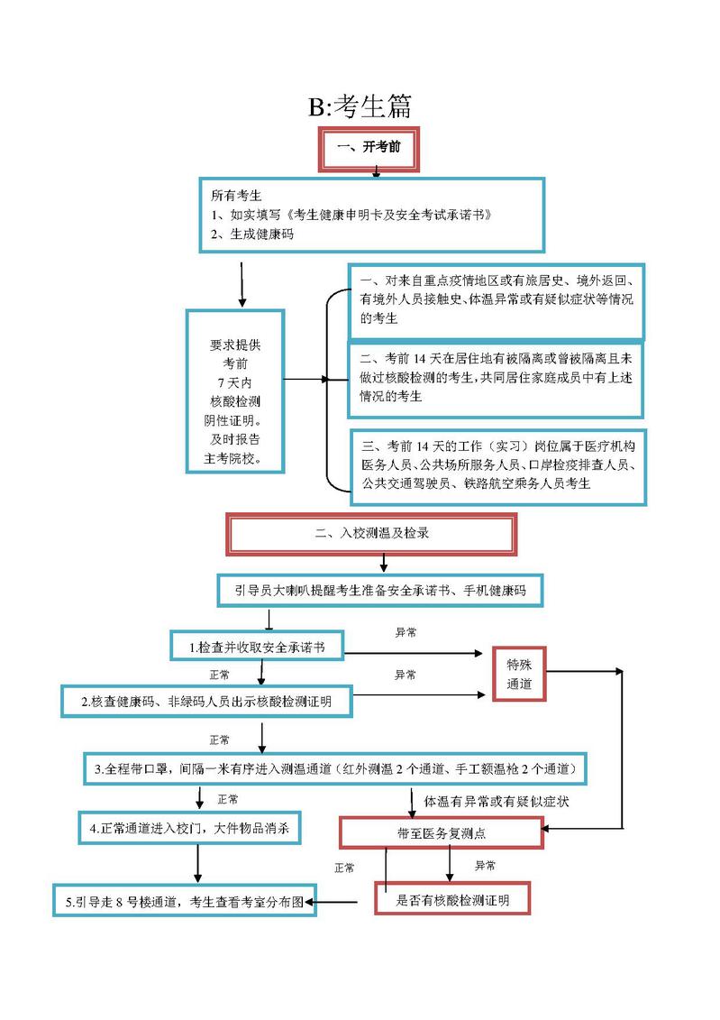 1.来自重点疫情地区或有旅居史、境外返回、境外人员接触史、体温异常或有疑似症状等情况,考前14天曾被隔离或曾被隔离未做过核酸检测、共同居住家庭成员有上述情况的考生,考前14天的工作(实习)岗位属于医疗机构医务人员、公共场所服务人员、口岸检疫排查人员、公共交通驾驶员或铁路航空乘务人员的考生,上述考生须提供考前7天内核酸检测阴性证明后方可进入学校,无提供核酸证明者不得进入校园!