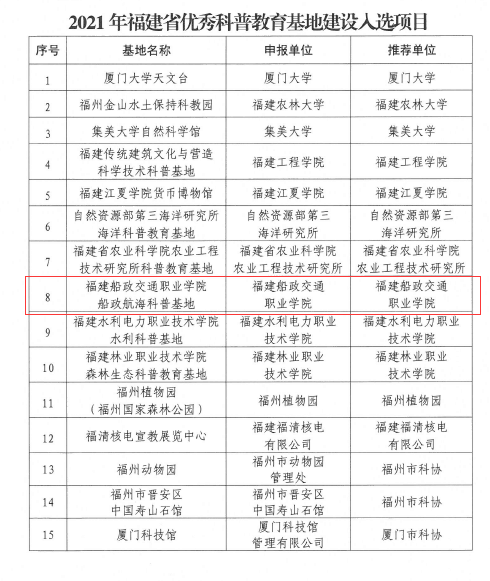近日,根据福建省科学技术协会下发的《关于签订2021年福建省优秀科普教育基地建设项目任务书的函》,我院船政航海科普基地成功入选2021年“福建优秀科普基地”建设项目。