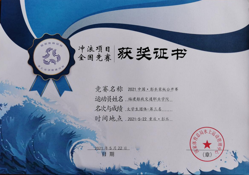 发布者:发布时间:2021-06-10浏览次数:347 近期,由国家体育总局水上运动管理中心主办的“第十届中国•彭水桨板公开赛”在重庆举行。学院选派8名学生组成代表队首次参赛,全体队员发挥不惧压力、勇于拼搏的精神,共获得大学生组5个单项奖,团体总分第三名的优异成绩。 学院桨板队成立于2021年年初,队员们刻苦训练,竞技水平迅速提高。驽马十驾、功在不舍。下一步,学院将围绕航海技术等亲水专业的“技能+素养”双适任人才培养目标,广泛开展桨板、龙舟、福船非遗等素养育人实践活动,坚持育人为本、促进学生全面发展。(航海学院、通识学院)
