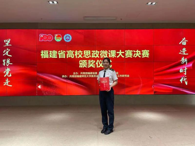 “坚定跟党走,奋进新时代”福建省高校思政微课大赛经过为期半年的初赛、网络展示等激烈角逐,总决赛于6月21日在福建师范大学旗山校区举行。我院学子陈静怡同学微课作品《学好四史,牢记初心使命》荣获高职高专组特等奖!