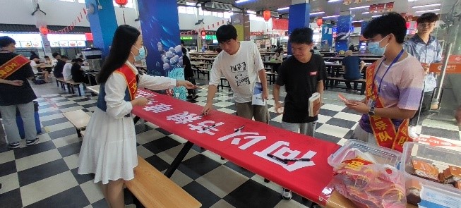 以新生开学为契机,在学院制作“何以节粮,唯有空盘”签名横幅,让报到的新生在签名墙上签署承诺,为粮食安全作代言,争做粮食安全文明使者,向浪费粮食说“不”。