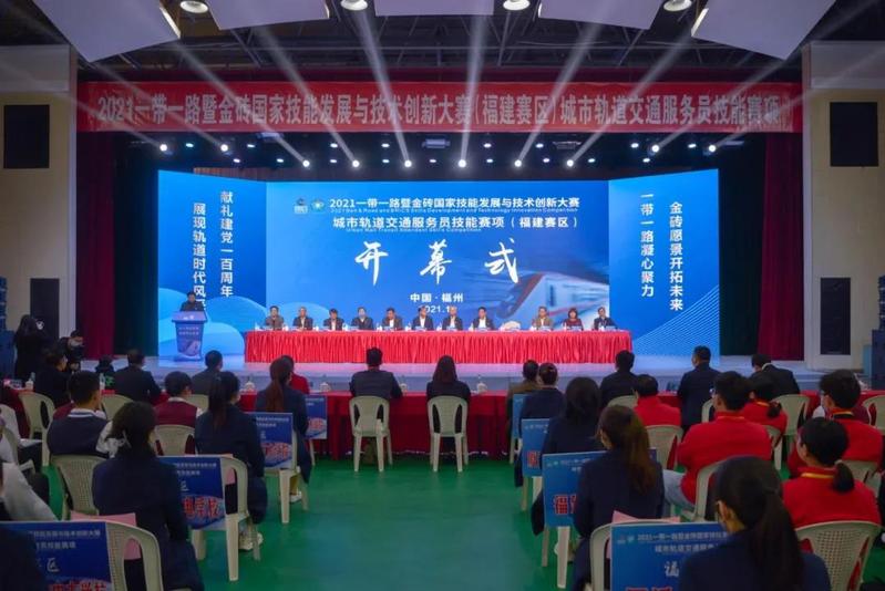 2021年11月27日上午,2021一带一路暨金砖国家技能发展与技术创新大赛城市轨道交通服务员技能赛项(福建赛区)预赛开幕式在我院文体中心隆重举行。