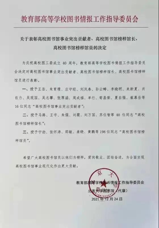 发布者:发布时间:2021-12-27浏览次数:312 祝贺图书馆解露路老师荣获教育部高等学校图书情报工作指导委员会“高校图书馆榜样馆员”荣誉称号!(图书馆)