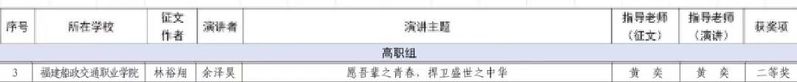 日前,中共福建省委教育工委印发《关于公布第六届“马克思主义能够给予我们什么”福建省高校大学生主题征文和微演讲活动获奖名单的通知》。经高校推荐、专家评审、网上公示等环节,省委教育工委评选出第六届“马克思主义能够给予我们什么”福建省高校大学生主题征文和微演讲活动获奖名单,我校作品《愿吾辈之青春,捍卫盛世之中华》(征文作者:林裕翔,演讲者:余泽昊,指导教师:黄奕)获二等奖。