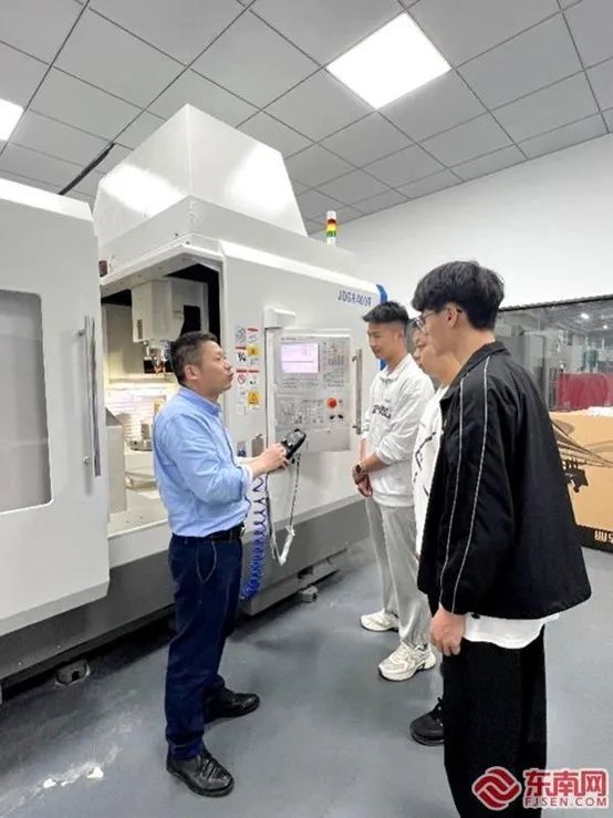 邹泽昌(左一)正在给学生讲解机床操作要领图片来源:东南网