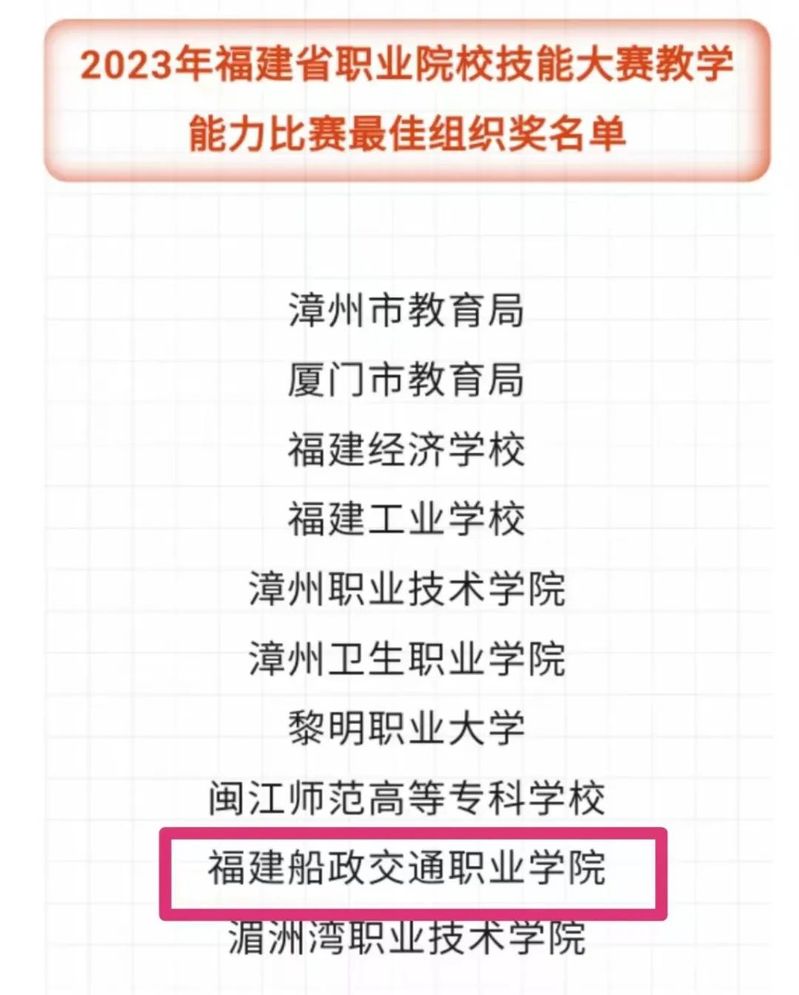 近期,省教育厅公布2023年福建省职业院校技能大赛教学能力比赛获奖名单。我校成绩优异,共获奖11项,其中一等奖4项,二等奖3项,三等奖4项,成绩位列福建省前列,并荣获最佳组织奖。