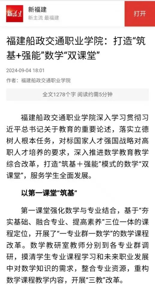 福建船政交通职业学院深入学习贯彻习近平总书记关于教育的重要论述,落实立德树人根本任务,对标国家人才强国战略对高职人才培养的要求,深入推进数学教育教学综合改革,打造“筑基+强能”模式的数学“双课堂”,服务学生全面发展。