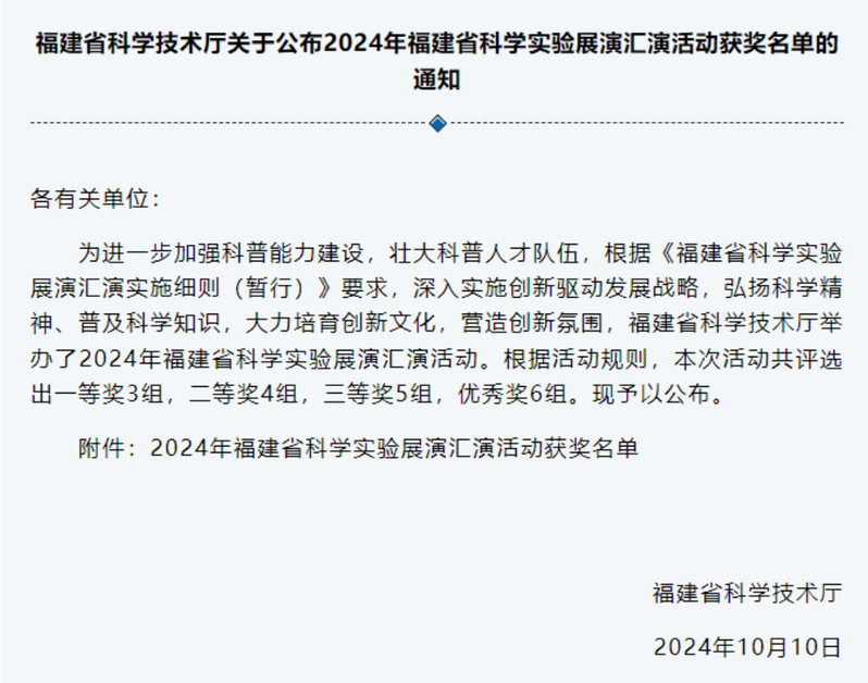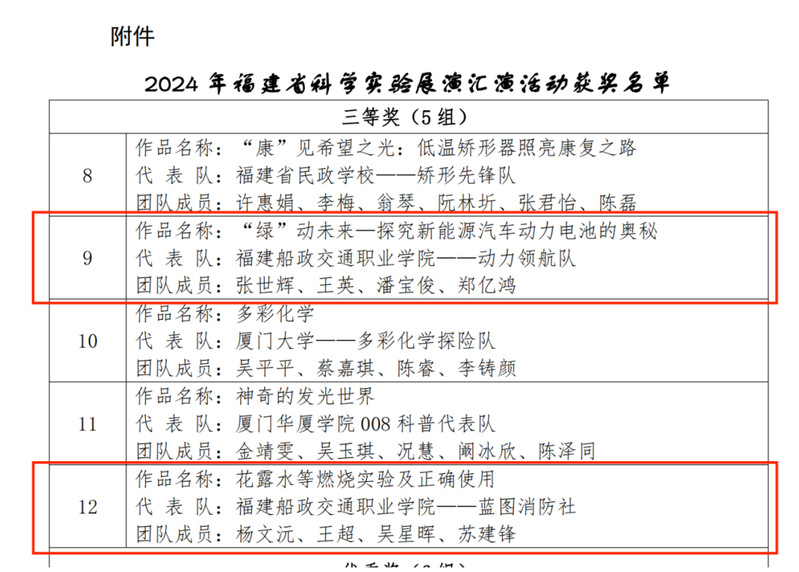 近日,由福建省科学技术厅主办的2024年福建省科学实验展演汇演大赛在福州举行,我院科技处选送的汽车学院作品“‘绿’动未来—探究新能源汽车动力电池的奥秘”科普实验项目、安全与环境学院作品“花露水等燃烧实验及正确使用”科普实验项目荣获三等奖。