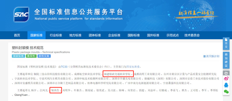 近日,国家市场监督管理总局、国家标准化管理委员会发布中华人民共和国国家标准公告(2024年第22号),以我院作为第三起草单位、省级技能大师工作室领办人邹泽昌作为起草人的国家标准《塑料封装模 技术规范》(GB/T 14663-2024)获批发布,将于2025年4月1日开始实施。该标准是我院中国特色高水平高职学校建设的又一项重要成果。