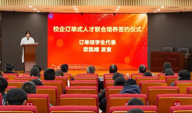 订单班学生欧凯婧发言,她表示将珍惜订单班学习的机会,以行业需求为导向,扎实学习监测技术,践行环保责任,以专业能力服务生态治理,为生态文明建设贡献青春力量。