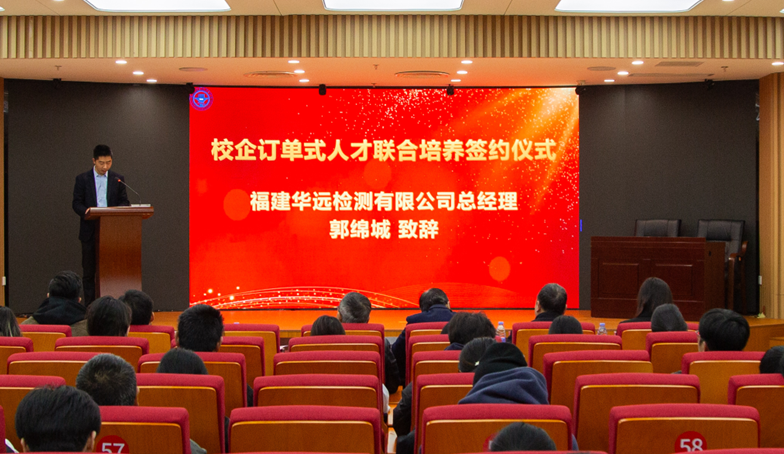 福建华远检测有限公司总经理郭绵城代表签约企业致辞,他指出订单班将以行业需求为导向,依托企业技术资源与学院教学优势,通过“工学交替+项目实战”的模式培养复合型环境监测人才,为环保产业高质量发展注入新生力量。