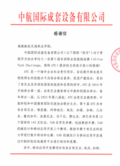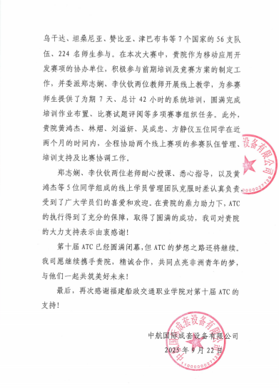 近日,由中航国际成套设备有限公司、肯尼亚教育部和中国教育国际交流协会联合主办的第十届非洲职业技能挑战赛(Africa Tech Challenge,简称“ATC”)圆满落幕。我院信息与智慧交通学院师生团队全程护航移动应用开发赛项,以专业师资精准授课、青年志愿暖心服务,圆满完成了线上培训与技术保障任务,并获主办单位中航国际成套设备有限公司专函致谢。