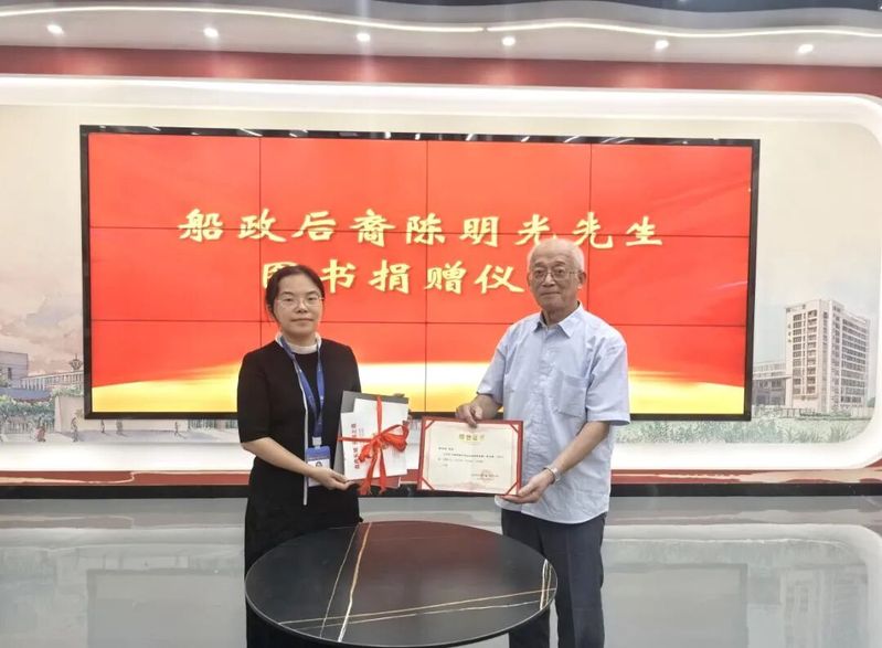 陈明光先生与船政渊源深厚,此次到校捐赠了个人收藏的船政历史图书,内容涉及抗战船政人物、福州抗日志士等。他希望以书为桥,让船政精神在年轻一代中延续。