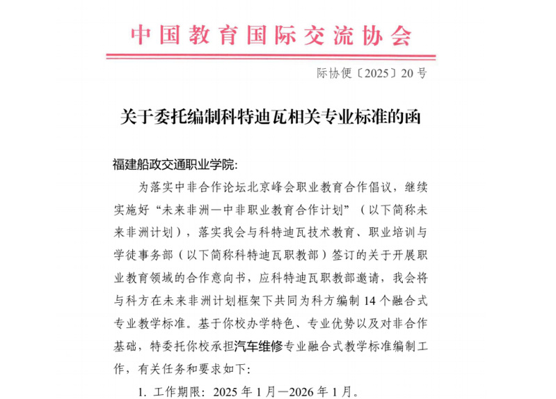此次入选是学院多年来深耕非洲开展“职教出海”取得的丰硕成果,也彰显了学院教随产出,随企出海,校企携手“走出去”、服务“一带一路”倡议、深化中非职业教育合作的显著成效。未来,学院将持续拓展中非职业教育合作领域,厚植中非职业教育合作友谊,不断提升对外开放和国际化发展水平。