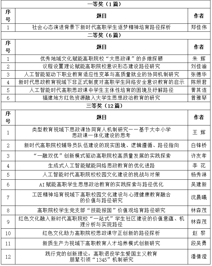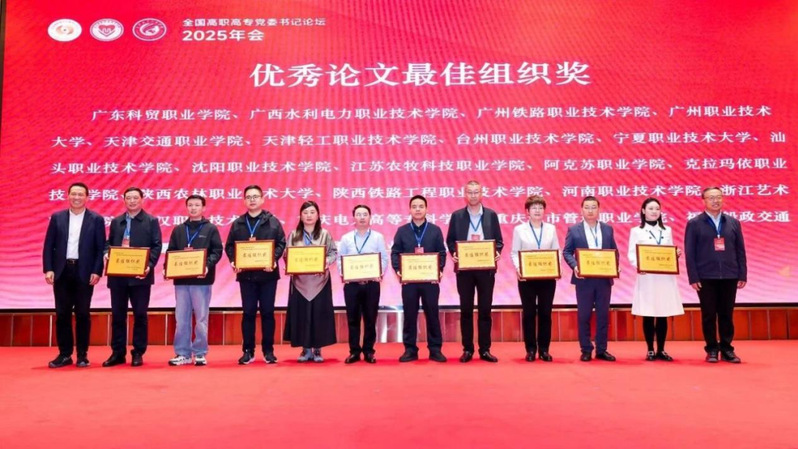 会议围绕“认真学习贯彻党的二十届四中全会精神,落实教育强国建设规划纲要,开创新时代高职院校党的建设和思政教育新局面”,深入探讨新时代高职院校党的建设与思想政治工作高质量发展路径,为推进教育现代化和强国建设凝聚广泛共识与行动力量。会议期间,全国高职高专党委书记论坛公布2025年获奖论文,我院选送的19篇论文获奖,其中一等奖1篇,二等奖6篇,三等奖12篇,我院获评“最佳组织奖”。在“思想政治”论坛上,我院辅导员郑佳伟以《社会心态演进背景下新时代高职学生逐梦精神培育路径探析》为题作经验分享。