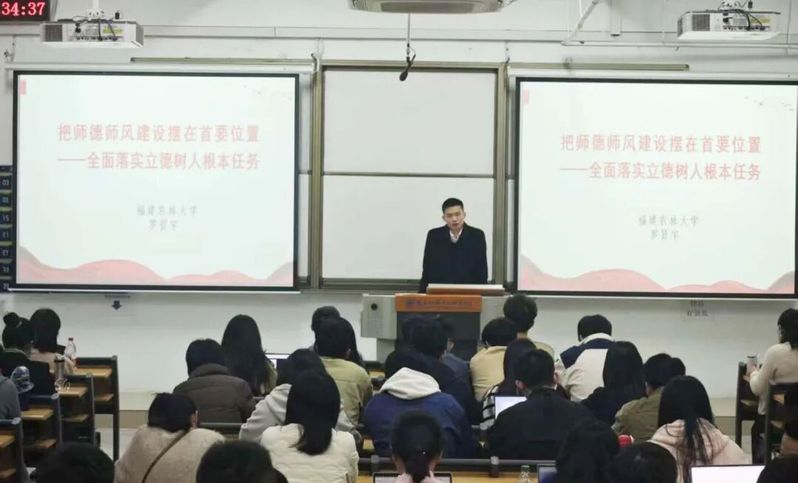 师德师风是教师队伍建设的灵魂,福建农林大学马克思主义学院罗贤宇教授在《把师德师风建设摆在首要位置——全面落实立德树人根本任务》专题讲座中,报告深入解读了新时代教师职业行为准则,结合典型案例,强调了筑牢师德底线、关爱学生成长、恪守学术道德的重要性。讲座引导新教师们深刻思考“为谁培养人、培养什么人、怎样培养人”这一根本问题,激励大家争做“四有”好老师,将立德树人根本任务内化于心、外化于行。