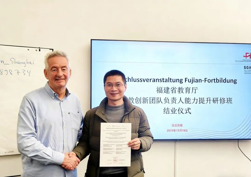 为系统汲取德国职业教育先进理念与成功经验,推动新能源汽车技术专业建设与人才培养模式改革,2025年11月30日至12月20日,我院汽车学院院长、新能源汽车技术省级职教创新团队负责人苏庆列老师赴德国参加福建省教育厅组织的“职教创新团队负责人能力提升专题研修”。本次研修团由省内多所院校的职教团队负责人组成,通过为期二十一天的理论学习、机构探访与深度交流,聚焦德国“双元制”职业教育体系的核心要义与实施路径。