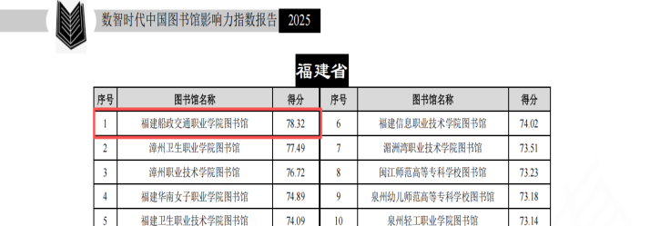 近日,武汉大学中国科学评价研究中心、数字出版智能服务技术教育部工程研究中心研究的《数智时代中国图书馆影响力指数报告(2025版)》正式发布。该报告对我国2919所普通高校图书馆(含1275所本科院校图书馆及1545所高职(专科)院校图书馆)、1980家公共图书馆和390家专业图书馆进行评价(不含港澳台地区图书馆),并从多维度产生多个排行榜。福建船政交通职业学院图书馆在2025年“中国高职高专图书馆影响力总排行榜”中,位列全国高职高专院校第11位、福建省高职高专院校第1位。