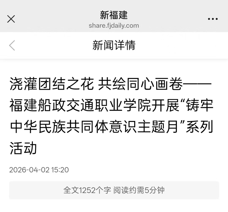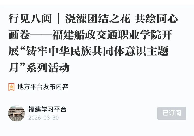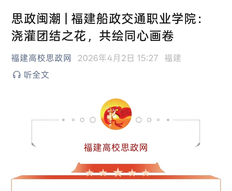 近日,学习强国福建学习平台、福建高校思政网、新福建等主流媒体发布《浇灌团结之花 共绘同心画卷——福建船政交通职业学院开展“铸牢中华民族共同体意识主题月”系列活动》,报道学院围绕“铸牢中华民族共同体意识”主线,精心组织开展“铸牢中华民族共同体意识主题月”系列活动。活动开展以来,学院从座谈交流、理论宣讲、文化浸润、实践体验、红色教育五个维度精准发力,组织全院师生广泛参与、深度互动,进一步凝聚起中华民族一家亲、同心共筑中国梦的强大合力。