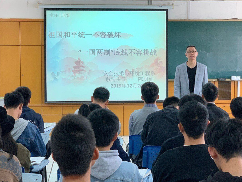 2019年12月24日下午,安全技术与环境工程系副主任陈明仙博士在科技楼801教室为安全技术与环境工程系各专业班级干部作了题为“祖国和平统一不容破坏、‘一国两制’底线不容挑战”的形式与政策报告。