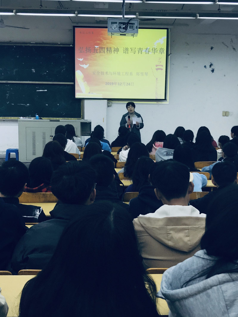 2019年12月24日中午,安全技术与环境工程系党总支书记郑雪琴教授在26号楼602教室为安全技术与环境工程系各专业班级干部作了题为“弘扬五四精神、谱写青春华章 ”的形式与政策报告。
