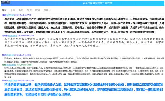 安全与环境第二党支部党员于8月19日集中学习了《习近平总书记在两院院士大会、中国科协第十次全国代表大会上重要讲话精神》,并在安全与环境第二党支部QQ群里展开了热烈讨论。习近平总书记强调要激发各类人才创新活力,建设全球人才高地。硬实力、软实力,归根结底要靠人才实力。全部科技史都证明,谁拥有了一流创新人才、拥有了一流科学家,谁就能在科技创新中占据优势。我国要建设世界科技强国,关键是要建设一支规模宏大、结构合理、素质优良的创新人才队伍,激发各类人才创新活力和创造潜力。正如习近平总书记指出的:“世界科技强国必须能够在全球范围内吸引人才、留住人才、用好人才。我国要实现高水平科技自立自强,归根结底要靠高水平创新人才。”