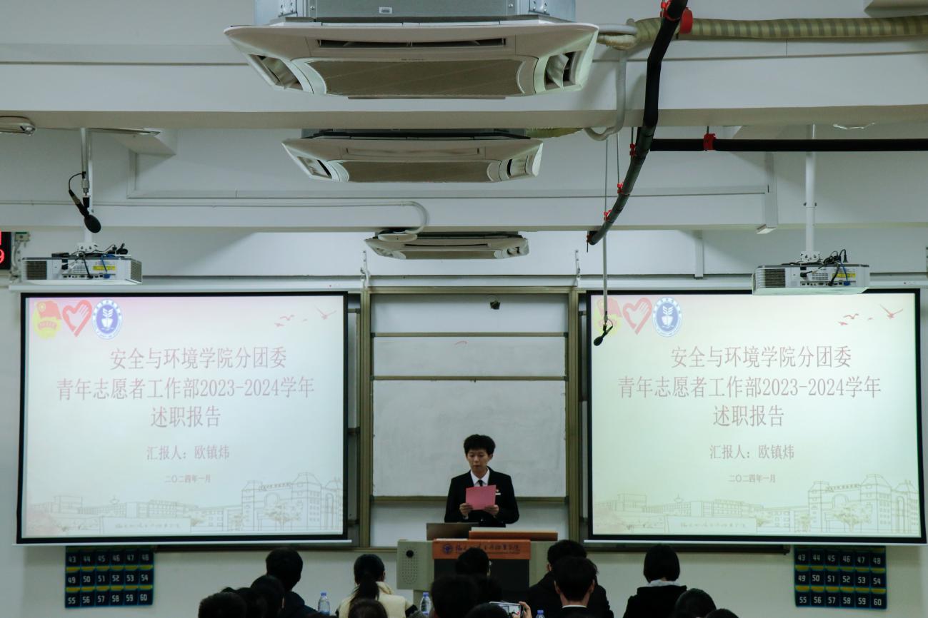 为深入学习贯彻习近平总书记关于青年工作的重要思想,进一步推动学生组织建设,提高学生干部综合素质,总结本学年工作实效,规划下一年度工作,2024年1月2日安全与环境学院在创新楼201教室组织召开团委学生干部述职大会。安全与环境学院团委书记彭志允、团委组织委员张晓珊、团委宣传委员李花、辅导员牟鹏飞、辅导员何瀚深莅临本次会议。