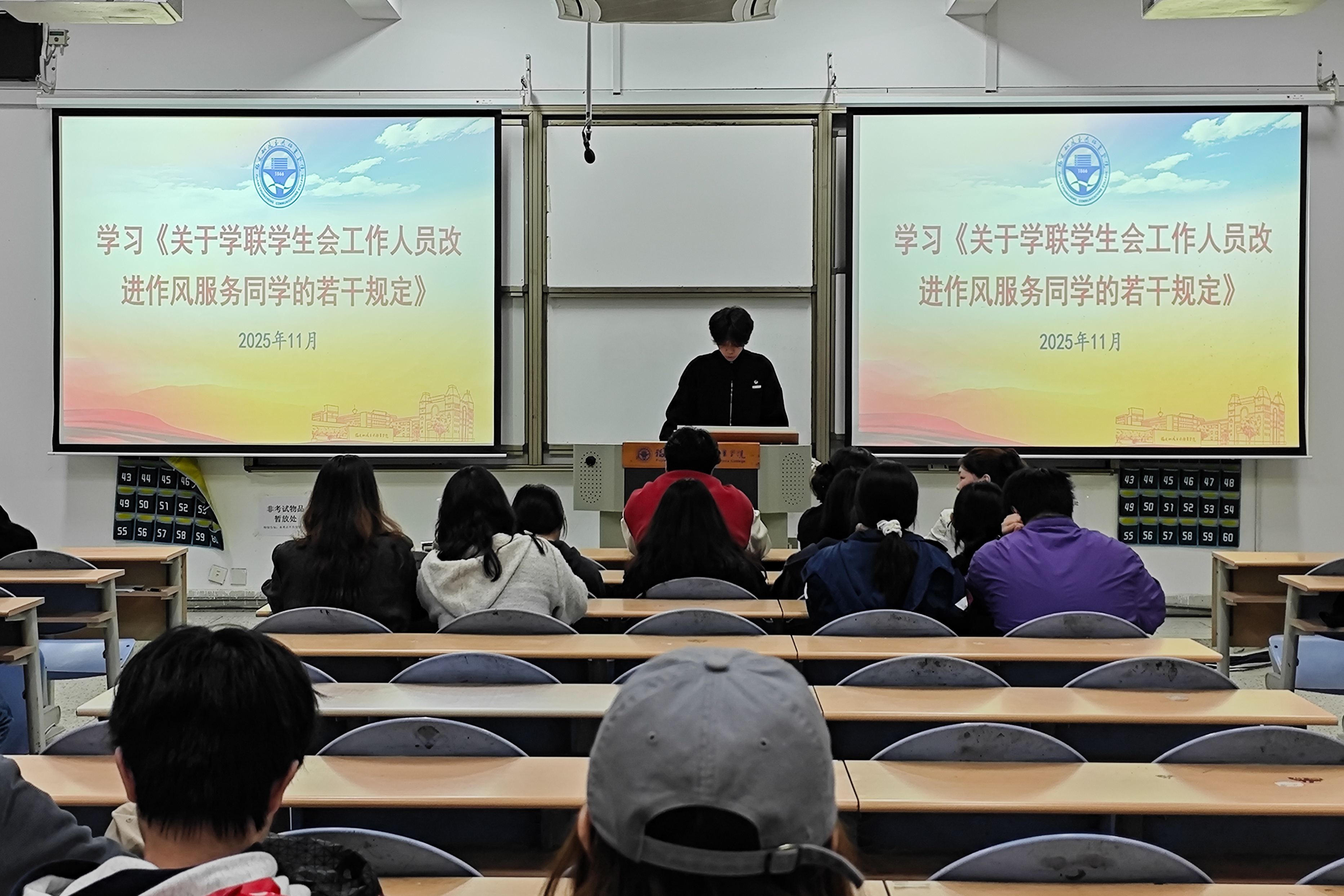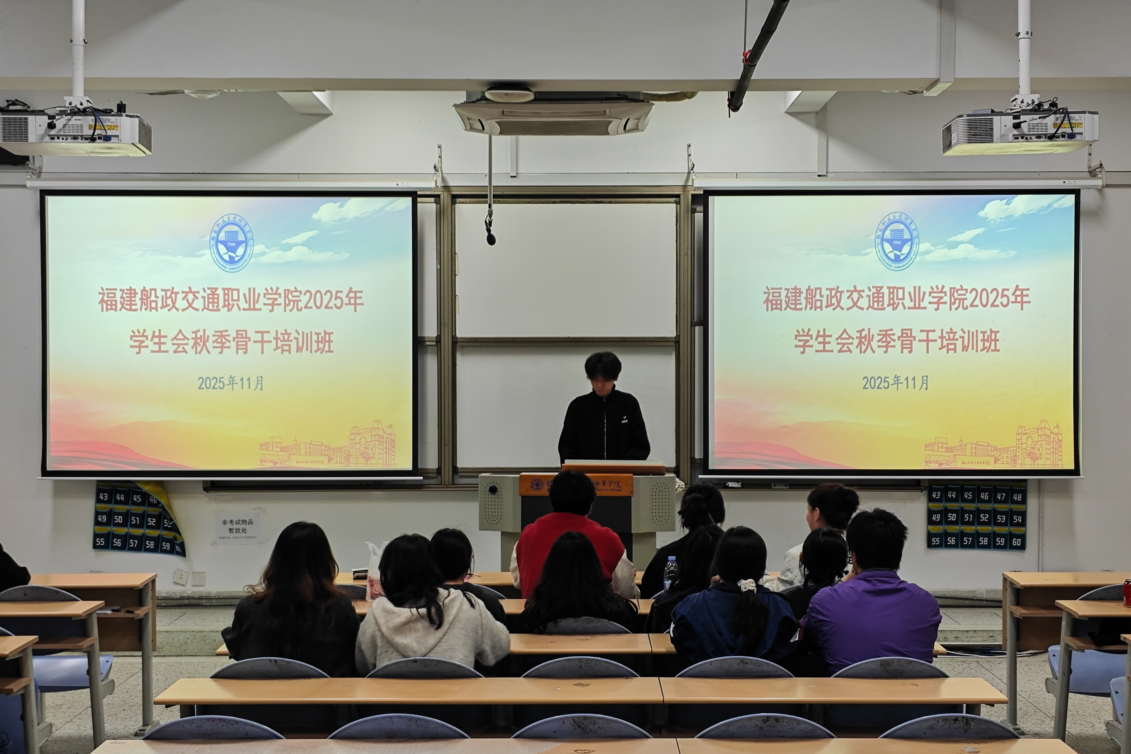 2025年11月12日,安全与环境学院于创新楼201教室举办2025年秋季学生骨干培训班。本次培训由校第九期“青马学员”、院学生会主席黄训臻主持,学院全体学生干部参加。