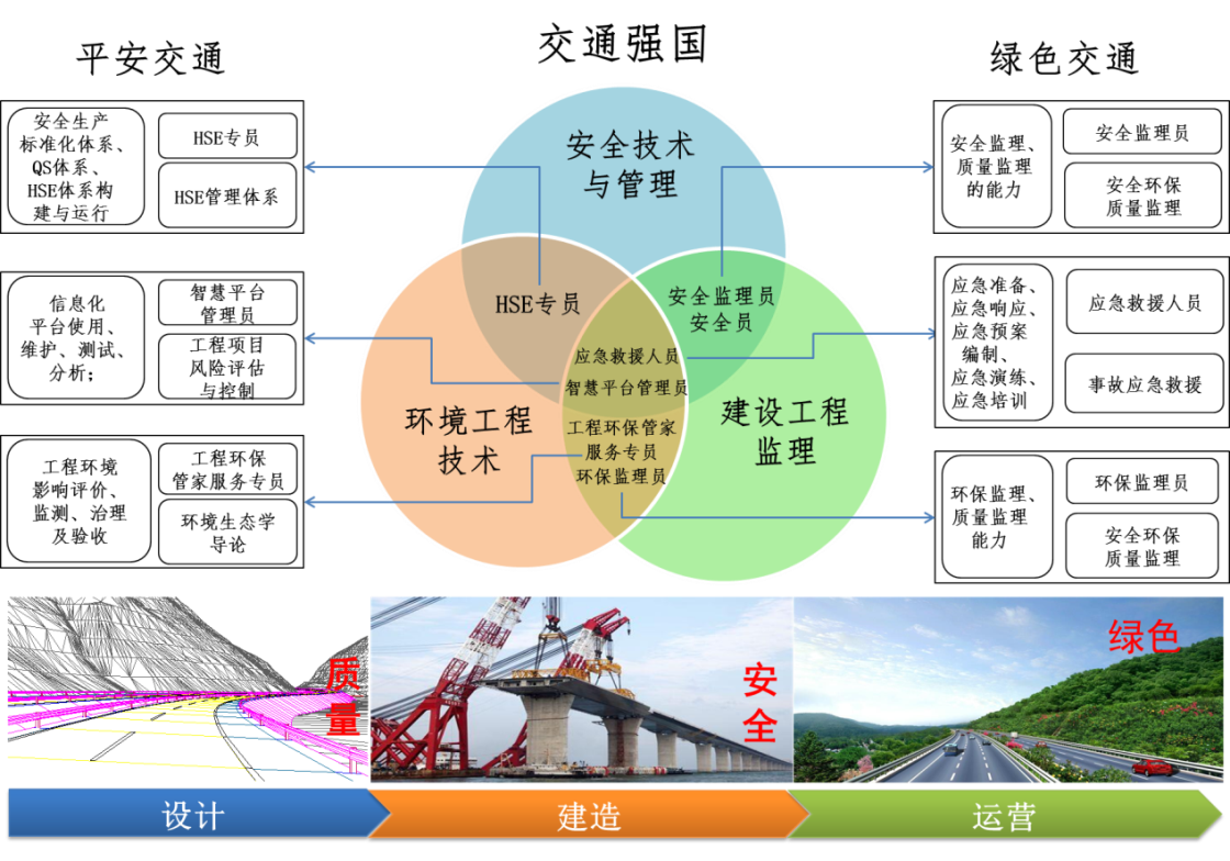 安全技术与管理专业群是面向交通工程建设、监理、评价咨询、监管、运营等领域用人单位,以立德树人为根本,突出安全、环保、质量三大关键意识;培养具备安全评价、监理及管理控制,环境评价、监测及监理,质量监理及控制,工程智慧化技术及管理等复合能力,具有可持续发展能力的安全员、监理员(质量监理、安全监理、环保监理等)、环境专员、健康安全环境(QHSE)专员、安全环境评价人员、应急救援人员、智慧工地管理员、工程环保管家服务专员等高端技术技能人才,为“交通强国”和区域经济社会发展提供优质人才资源支撑。