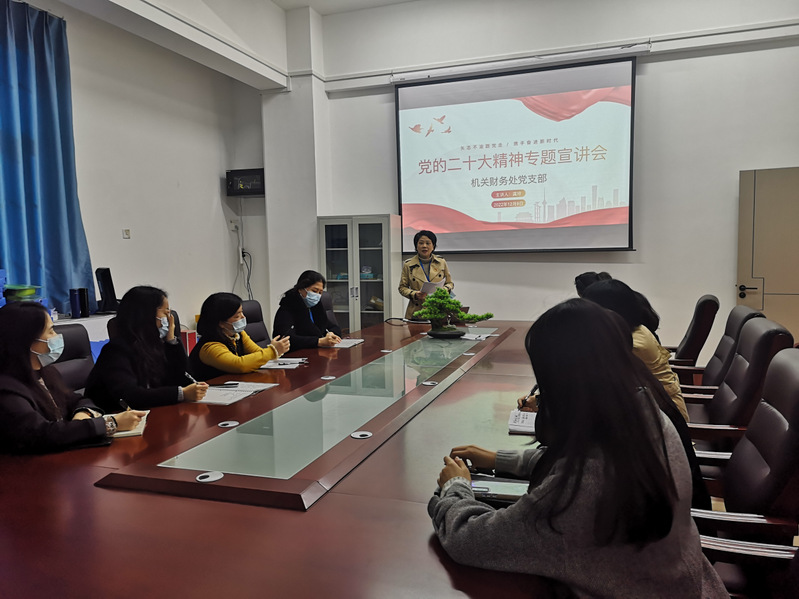 为深入学习宣传贯彻党的二十大精神,更好团结引领广大干部职工紧跟党奋进新征程,夺取新胜利,12月9日下午,机关财务处党支部在行政楼一楼评标室举行“矢志不渝跟党走,携手奋进新时代——学习贯彻党的二十大精神宣讲会”。党支部书记龚玲带领财务处全体干部职工齐聚一堂,共同学习领会党的二十大精神。本次活动采用“现场宣讲”的形式进行。
