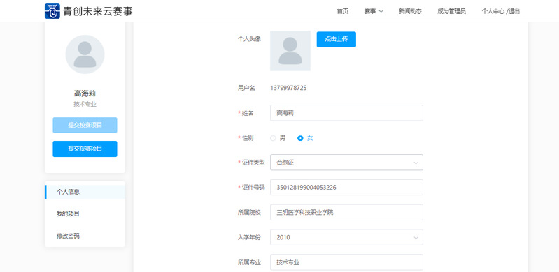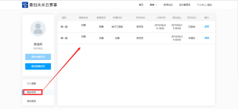 完成项目申报书上传,完成项目创建,“提交”成功后,在“个人资料”——“我的项目”中可查看已上传项目具体信息(届别、赛事名称、赛事级别、所属机构、项目名称、上传时间、报名截止时间以及项目状态)。