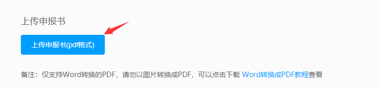 传项目后,需要上传项目申报书,点击“上传申报书(加盖公章的pdf扫描件)”,(备注:仅支持Word转换的PDF,请勿以图片转换成PDF,可以点击下载 Word转换成PDF教程查看),上传项目申报书。