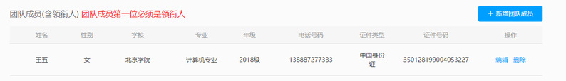 填写团队成员(含申报者本人)详细信息,点击“确定”即可保存。