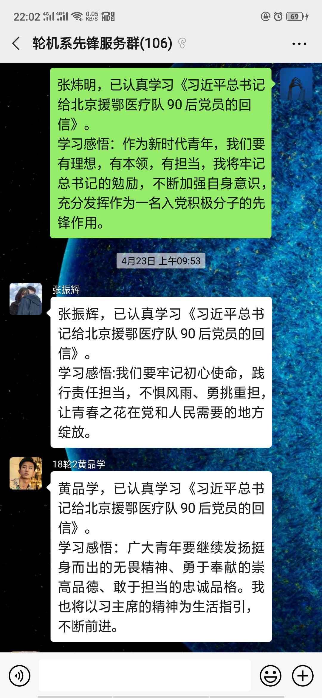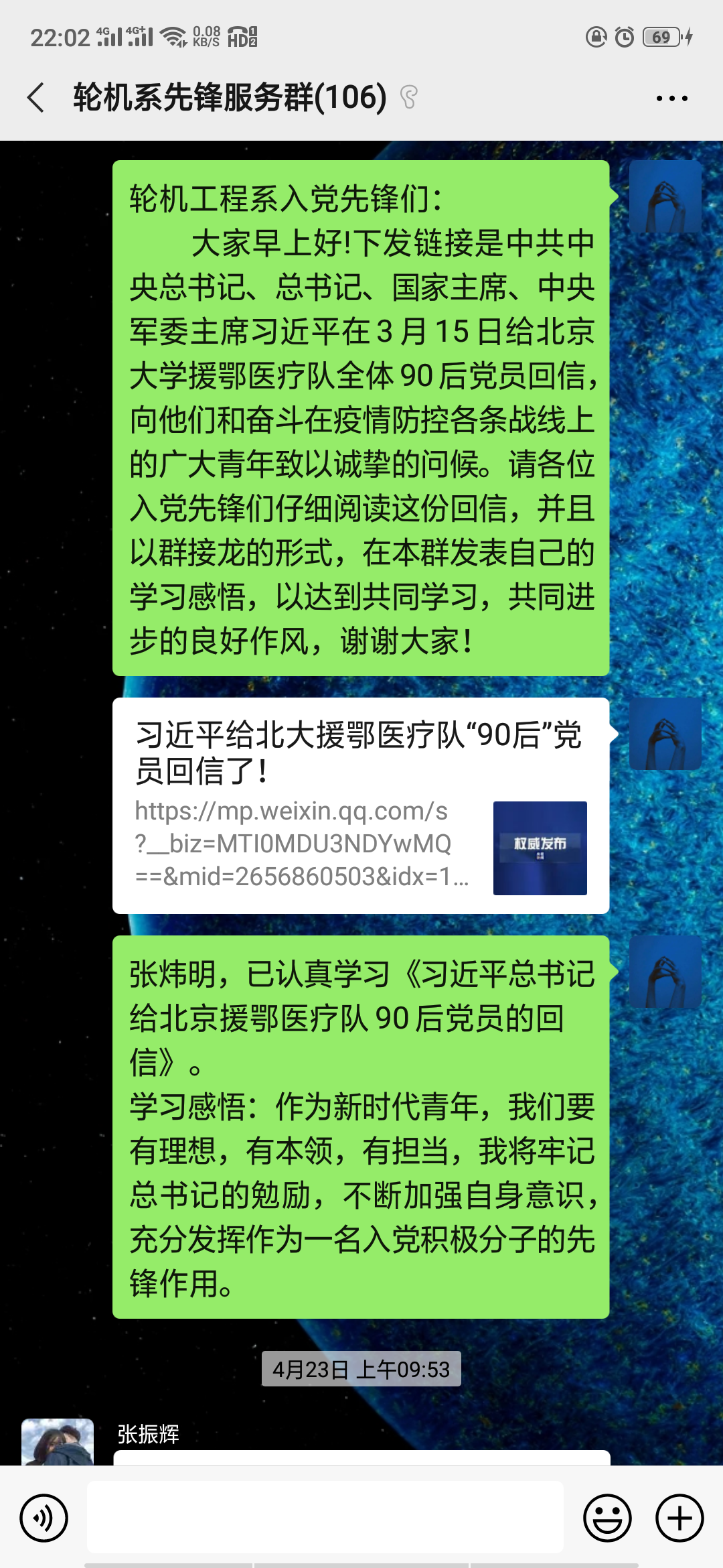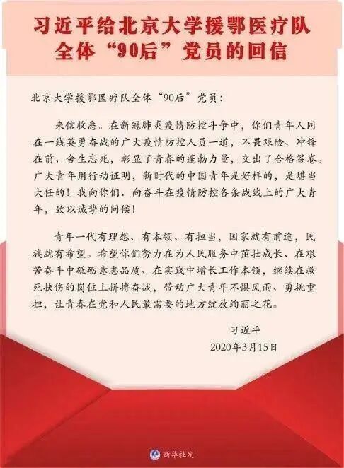感谢总书记和党中央对医疗队员的关怀,大家一定认真学习领悟回信精神,在前线发挥90后的全部能量,坚定打好这场疫情防控阻击战。最重要的不是“几零后”,而是“努力后”“奋斗后”,能够到祖国最需要的地方去,能够为国家作贡献、为人民服务,才是实现人生价值的最好途径。战疫的关键时刻,一定站好最后一班岗。