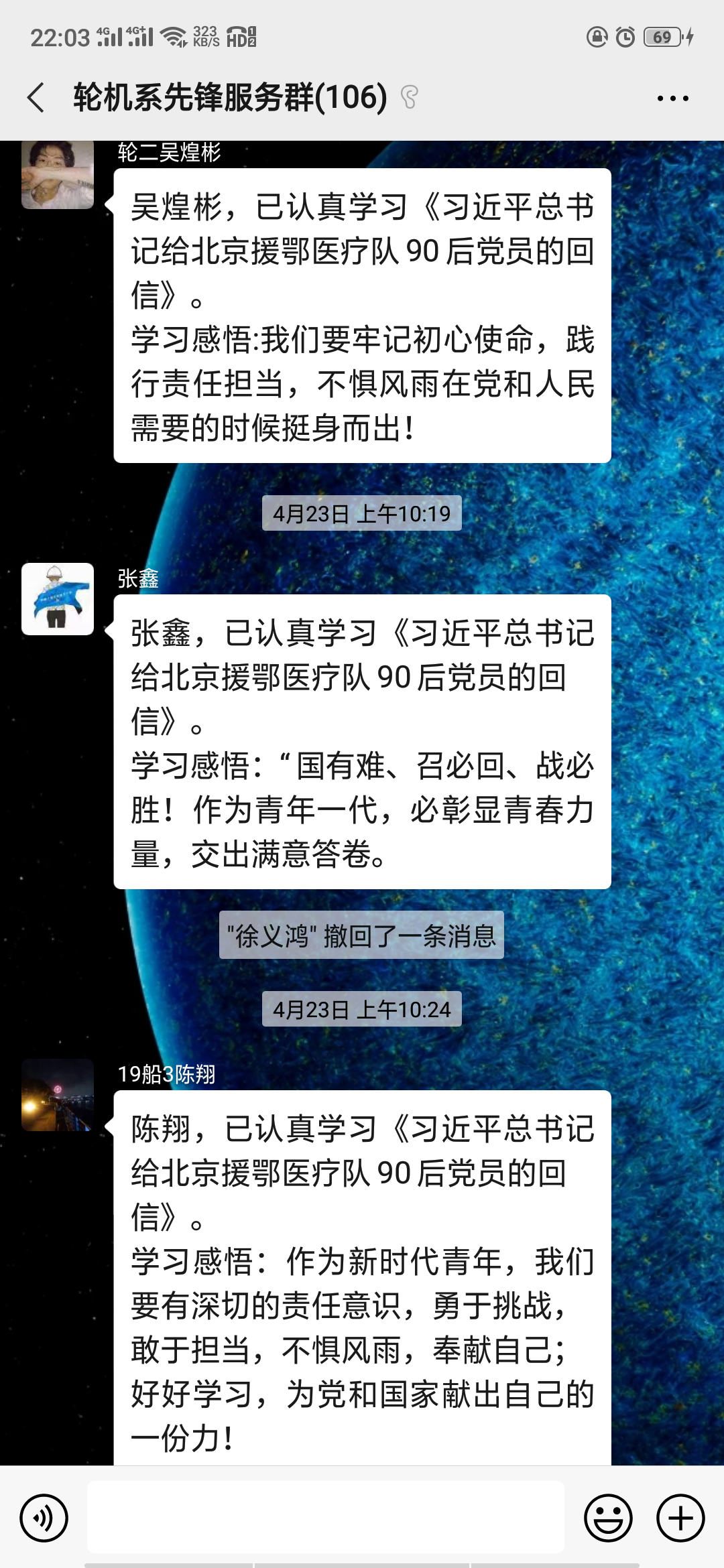 2017级轮机工程技术二班学生党员陈涛说:在疫情面前,当代青年“疫中有情,疫中见义”,这样的使命和担当,值得每一位青年学子思考与践行。我们定要珍惜这个时代,担负时代使命,在担当中历练,在尽责中成长,当祖国需要,当人民需要,我们都将奋力向前,永不退缩,走好我们这一代人的长征路。