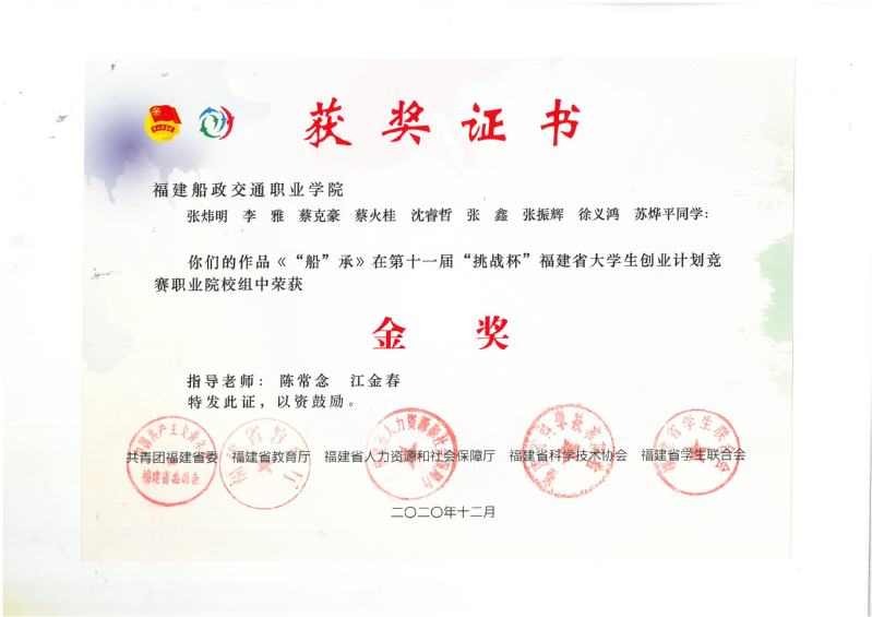 (6)荣获第十一届挑战杯福建省大学生创业竞赛(《船承》)省金奖;