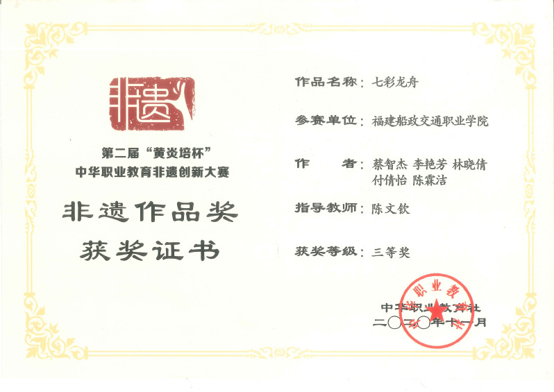 (4)成功复原赶缯船1:10模型-“清代战船”、福州传统龙舟1:10模型-“七彩龙舟”船模,并荣获第二届黄炎培杯中华职业教育非遗创新大赛《清代战船》、《七彩龙舟》一等奖、三等奖;