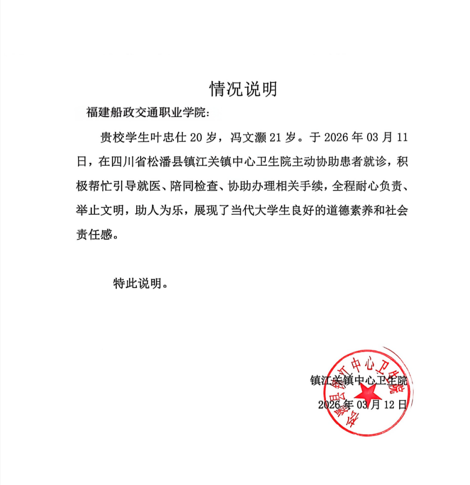 2026年3月11日傍晚六点左右,在四川省茂县叠溪镇国道上的隧道出口,独自自驾出游的43岁王先生突发高反、人感不适,于是他停车到隧道口拦车求助。恰巧拦到的是我校航海学院学生叶忠仕及其朋友的车。王先生自述在自驾过程中高反了,感到头胀、手脚麻木、呼吸困难。两位学生看到王先生脸色发白,连忙拨打了120急救电话,给王先生吸氧,并联系了王先生的妻子,然后驾车赶往最近的医院。在行驶的过程中,王先生表示人很难受,快要挺不住了,于是两位学生又拨打了120急救电话,在120的指导下把王先生送往最近的卫生院进行急救。由于送医及时,王先生已经转危为安、病情已明显好转。 这事体现了我校大学生良好的道德素养和社会责任感,值得表扬。