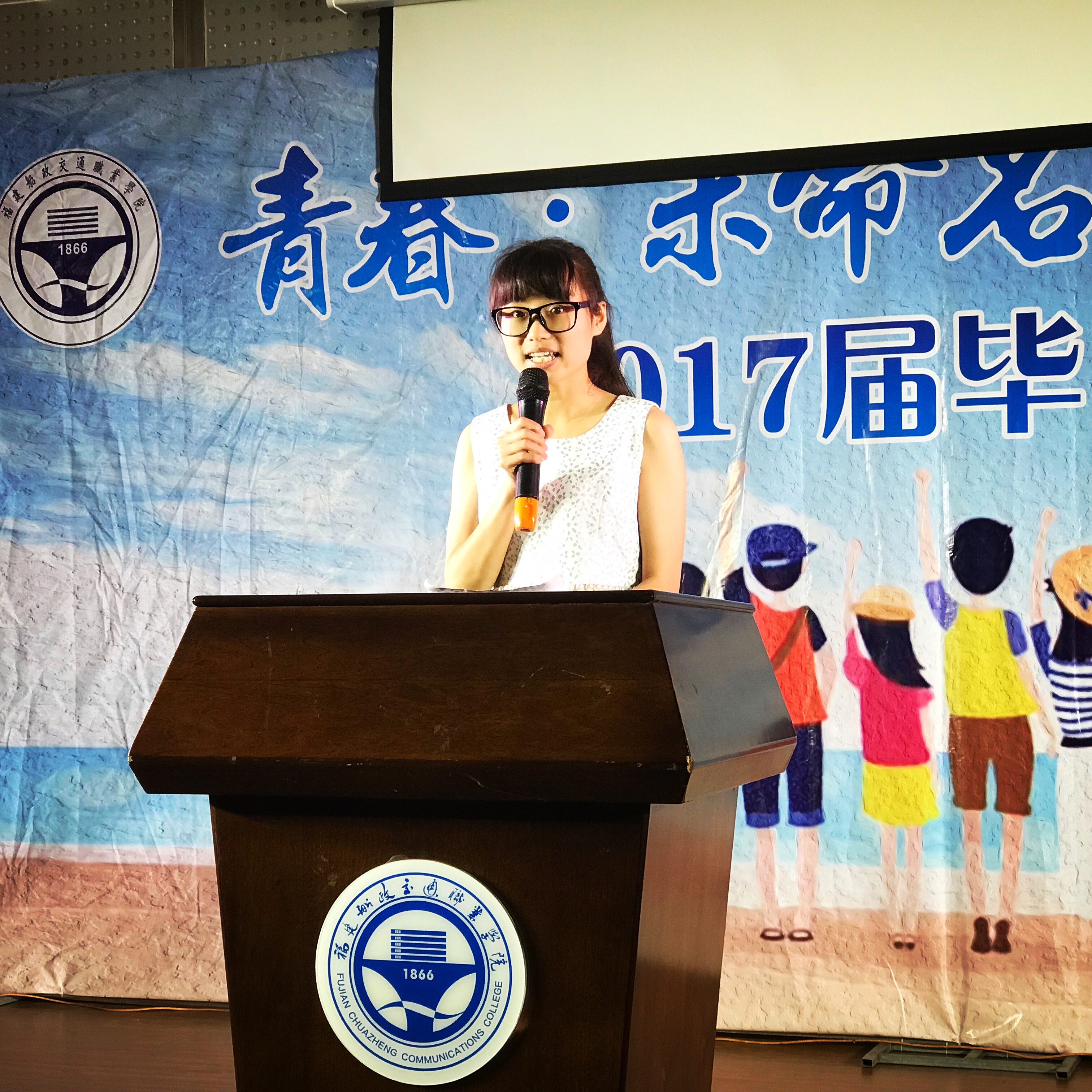 2013级工程管理本科班的郑欣凤发表了毕业感言。她对母校四年的培养表示感谢。她表示:“回首花样的年华,岁月的如歌,从相遇到相识,从相识到相知,因为努力,所以收获,有过开心,有过失落,而母校就是我们的心灵港湾,陪伴我们成长”,“敢闯敢拼”的道工精神将成为道工学子的人生信念。