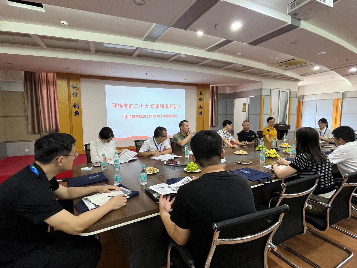 今年的9月10日是第38个教师节,也是我们中国的传统节日中秋节。为迎接党的二十大,恰逢双节来临之际,通过加强教师间的沟通和交流,关注学生成长成才,使新教师能更加快速地融入土木工程学院大家庭,更好地开展教育教学工作,开展主题为“迎接党的二十大 培根铸魂育新人”的教师座谈会。会议由卓维松副院长主持,学院副科级以上干部、临退休教师、教师代表和新进教师参加了座谈会。