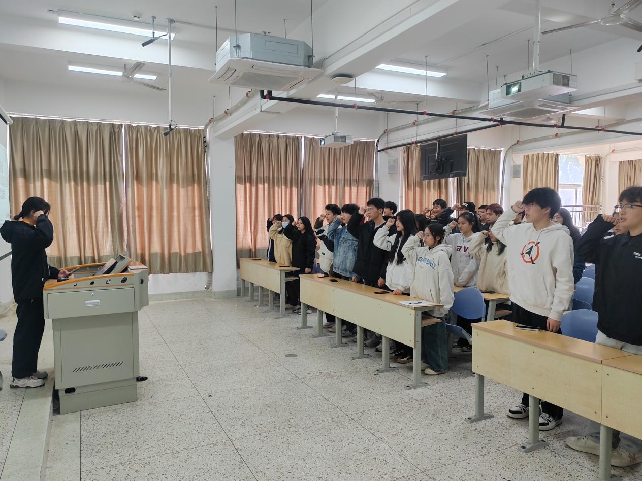 活动开始,胡启航老师阐述了诚信考试的重要性,强调了“诚信为人之本”的重大意义,鼓励班委们主动承担起加强学风建设的责任,呼吁同学们认真复习、积极备考。随后,参加人员全体起立,举起右手一同宣誓:“我庄严宣誓,自觉遵守考试纪律,公平参与考试竞争,珍惜名誉,诚信做人,诚实应考,以实力争取优异成绩,以诚信展现良好学风,诚信考试,绝不作弊,弘扬诚信考风,争做诚信考生 。”