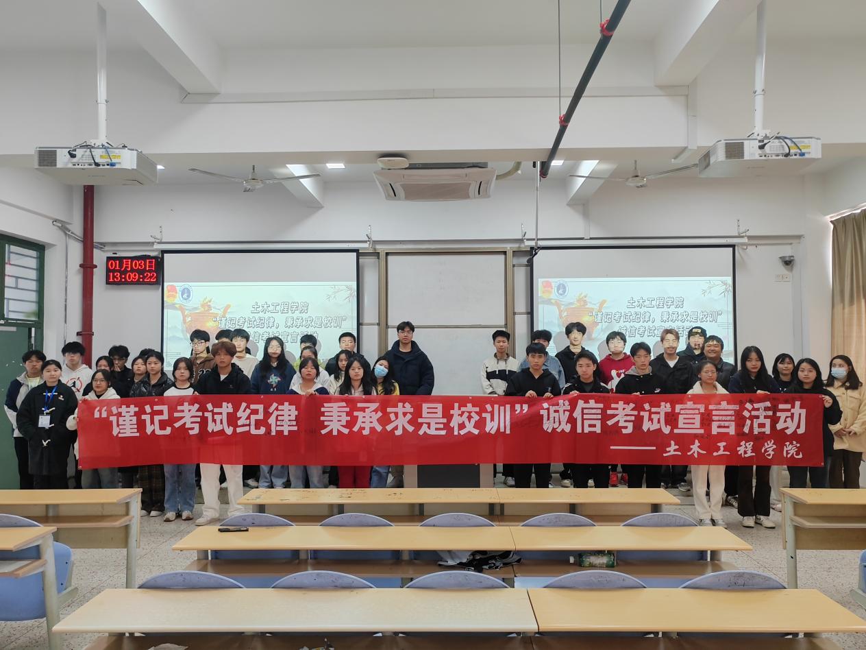 “树道德之风,立诚信之本,当诚信考生,做文明学生”。为端正考风,严肃考纪,提高学生的诚信意识,树立正确的价值观,1月3日,土木工程学院在创新楼302举办“谨记考试纪律,秉承求是校训”诚信考试宣言活动。