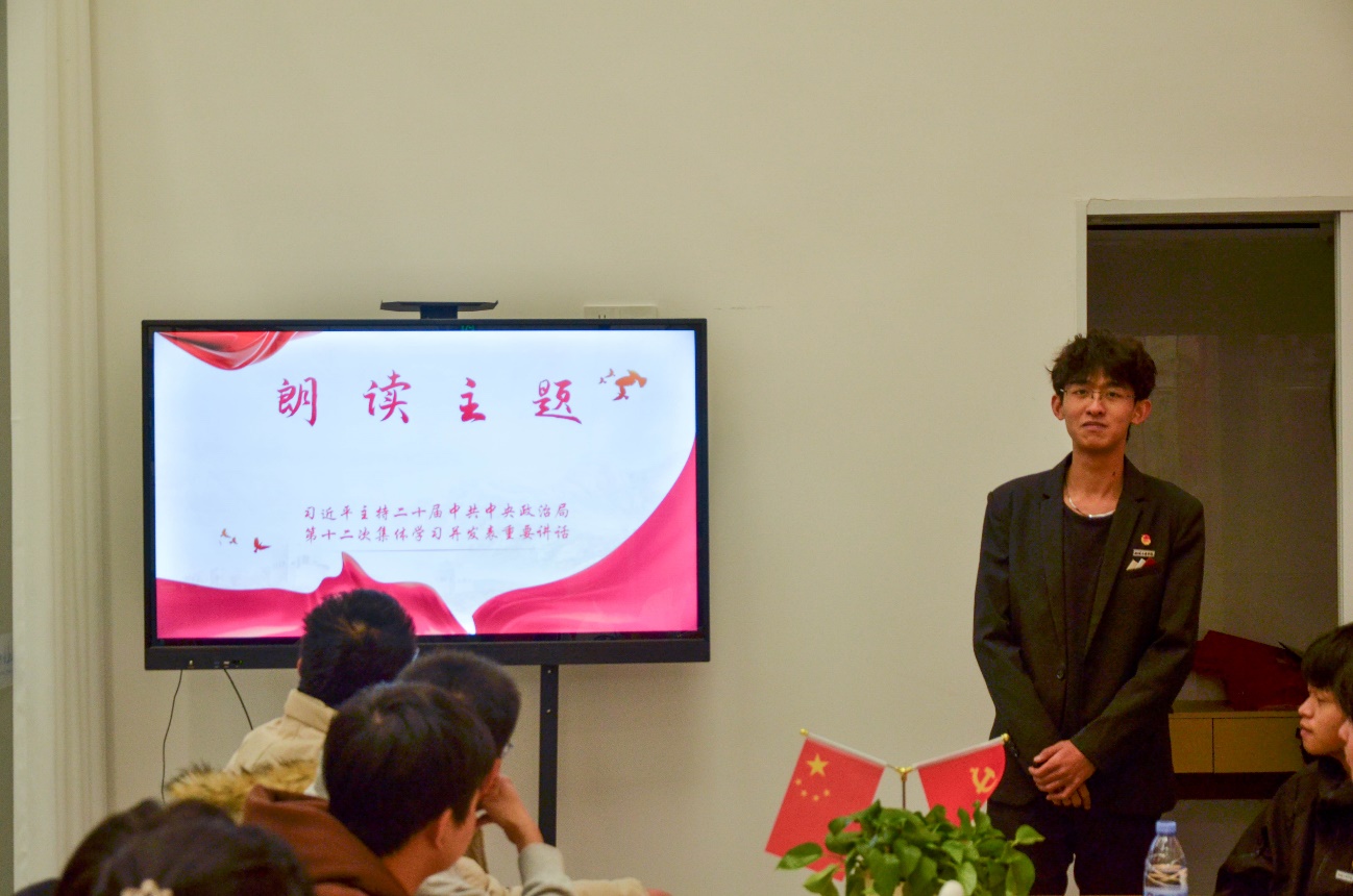 分享会上,23级道路与桥梁工程技术1班班长黄嘉骏,领学了习近平总书记在中共中央政治局第十二次集体学习时发表的重要讲话“大力推动我国新能源高质量发展,为共建清洁美丽世界作出更大贡献”。